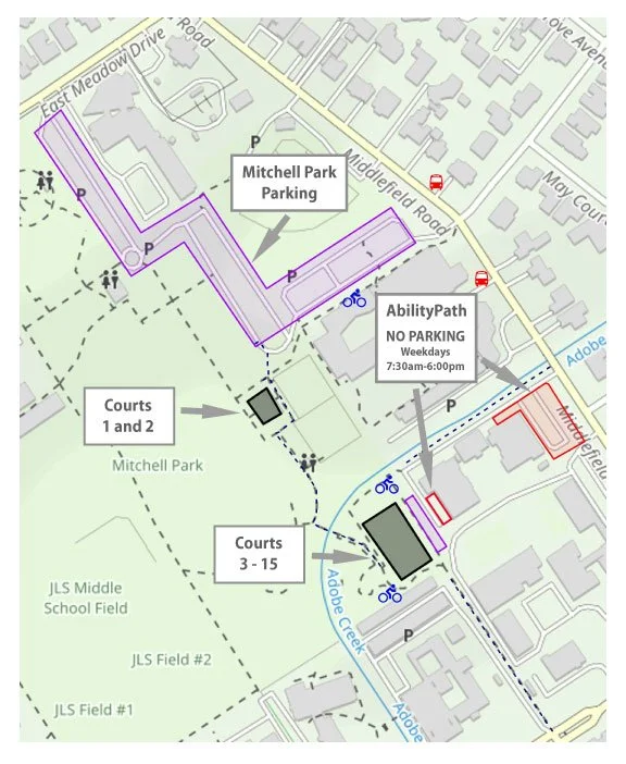 The Palo Alto Pickleball Club encourages everyone to walk, bike, use rideshare, or take public transportation to the courts. It's good for your health, good for the planet, and you arrive warmed up and ready to play!