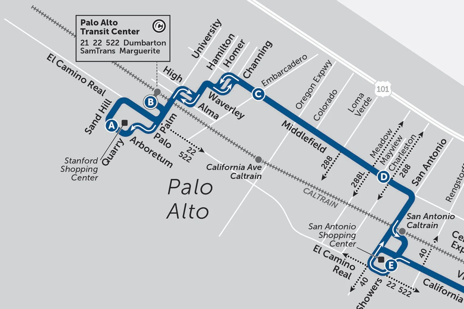 The VTA 21 bus goes along Middlefield Ave the length of Palo Alto on a regular schedule.